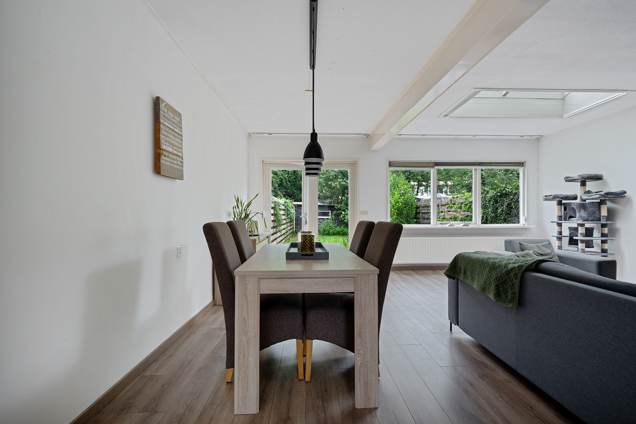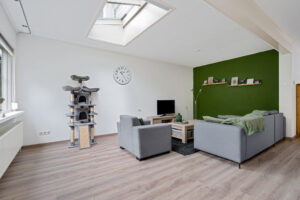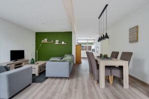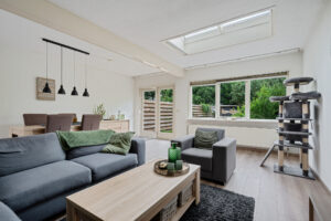 - royale woonkamer, met een lichtstraat en 2 openslaande deuren naar de tuin.