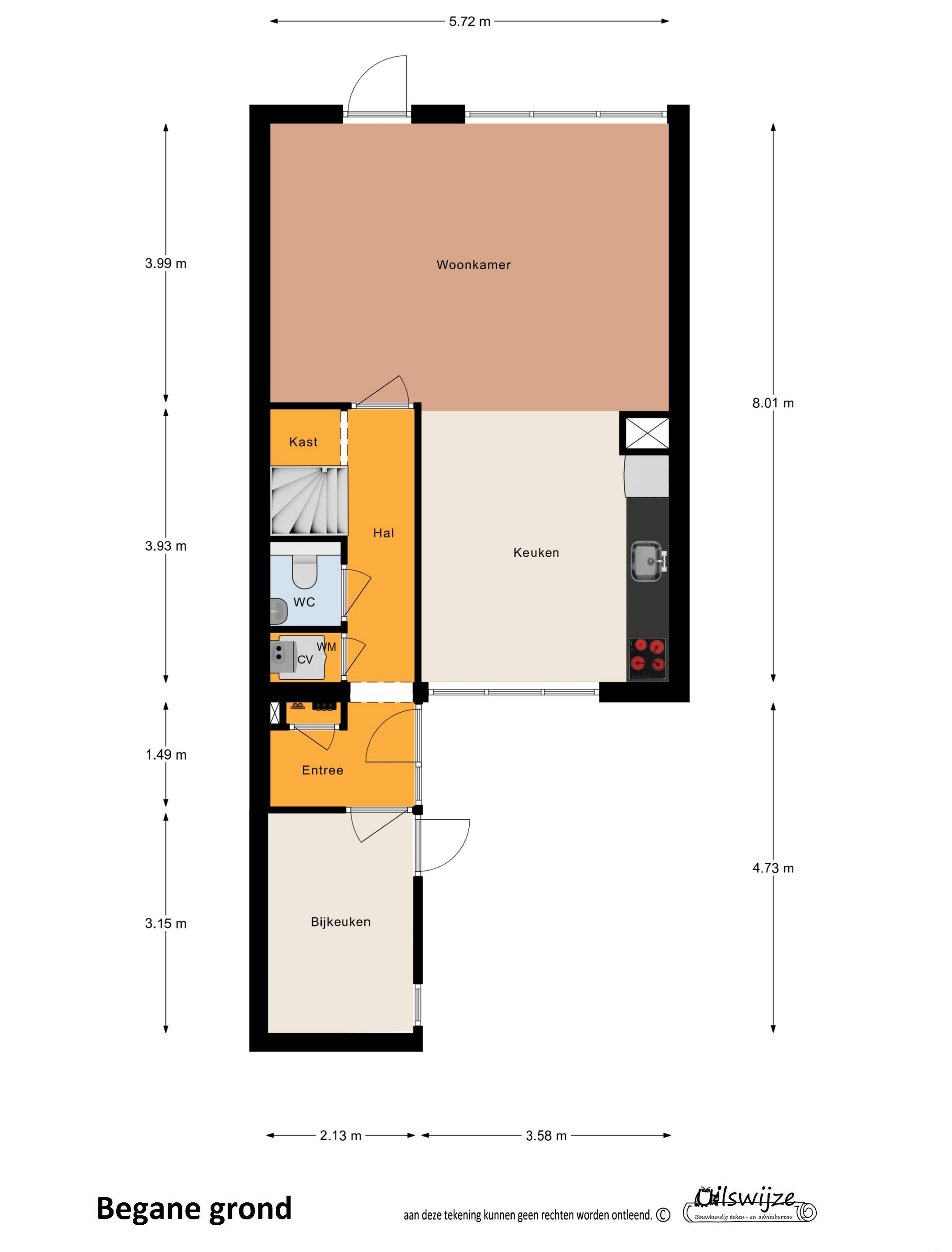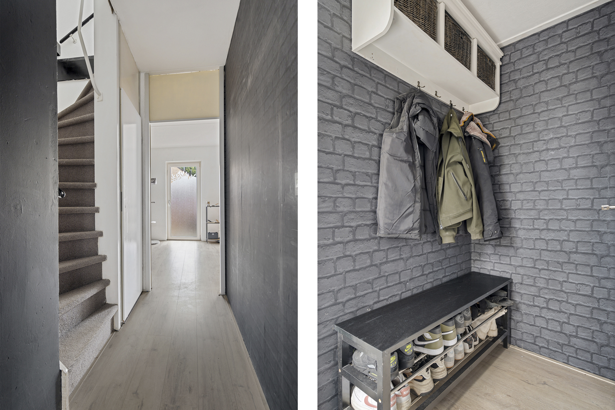 - hal/entree, voorzien van een trapkast en trapopgang naar de eerste verdieping;
