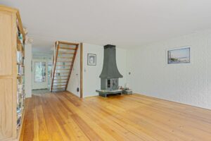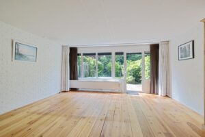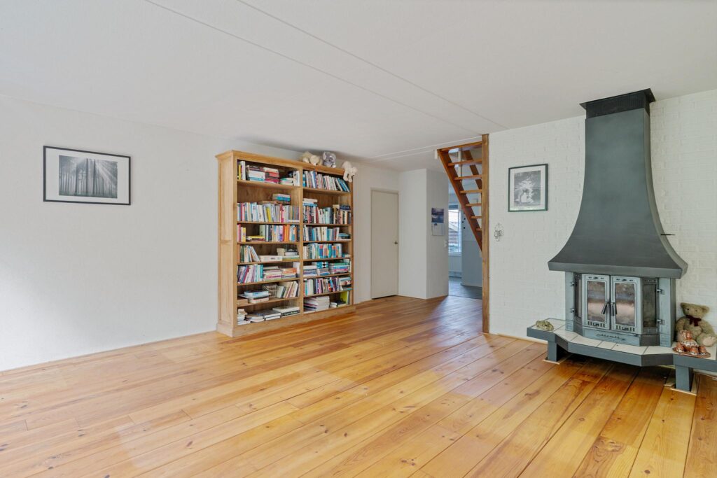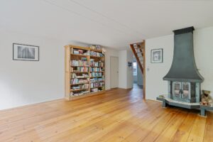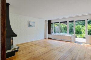 - ruime woonkamer voorzien van open haard, rolluiken en toegangsdeur naar de tuin;