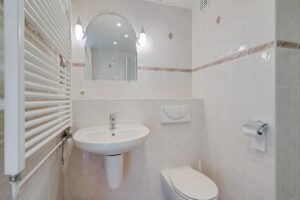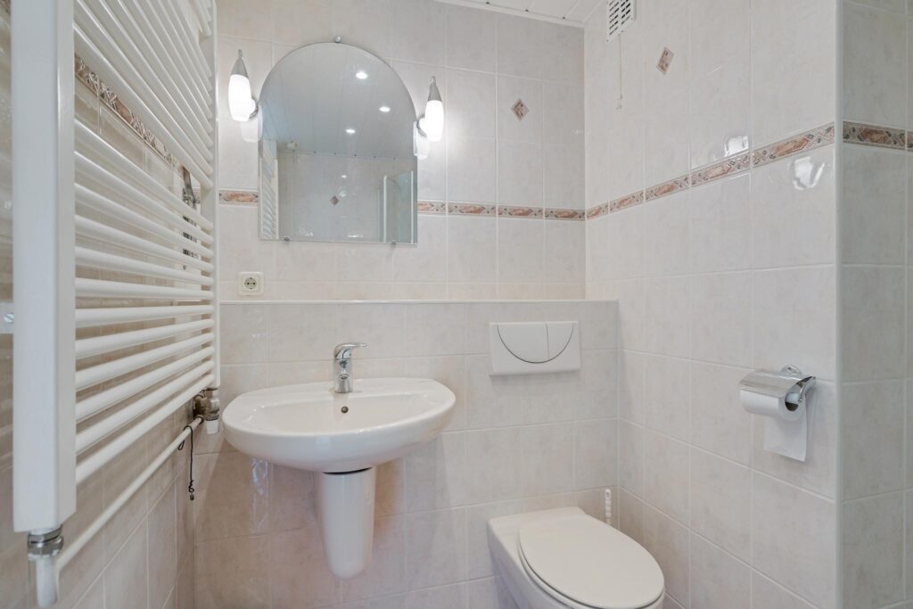 - badkamer voorzien van een douche, wastafelmeubel, hangtoilet en designradiator.