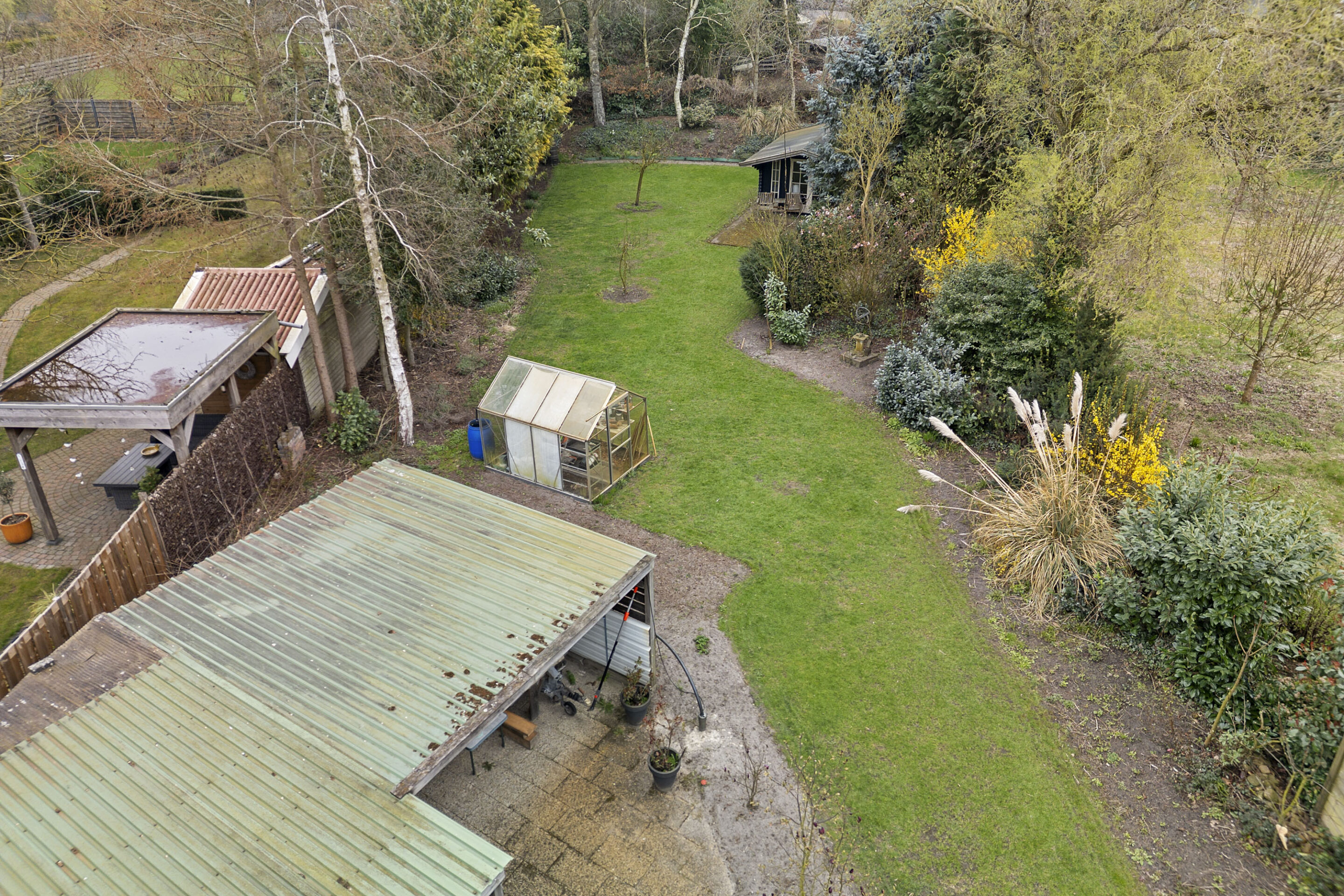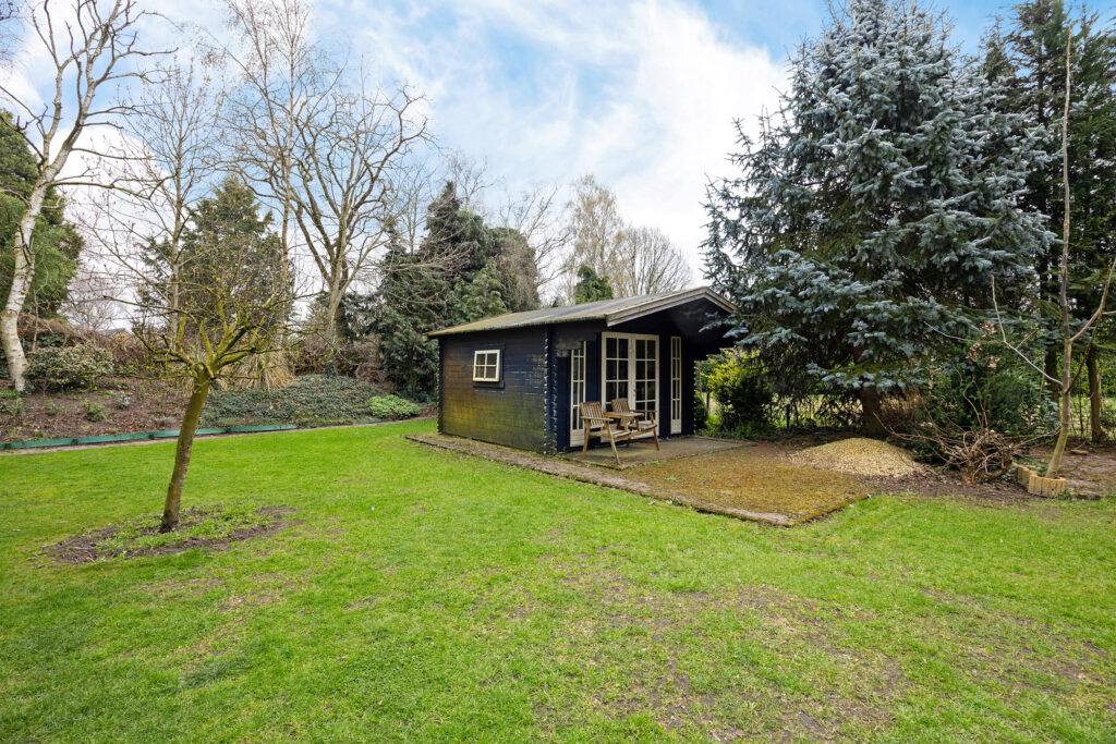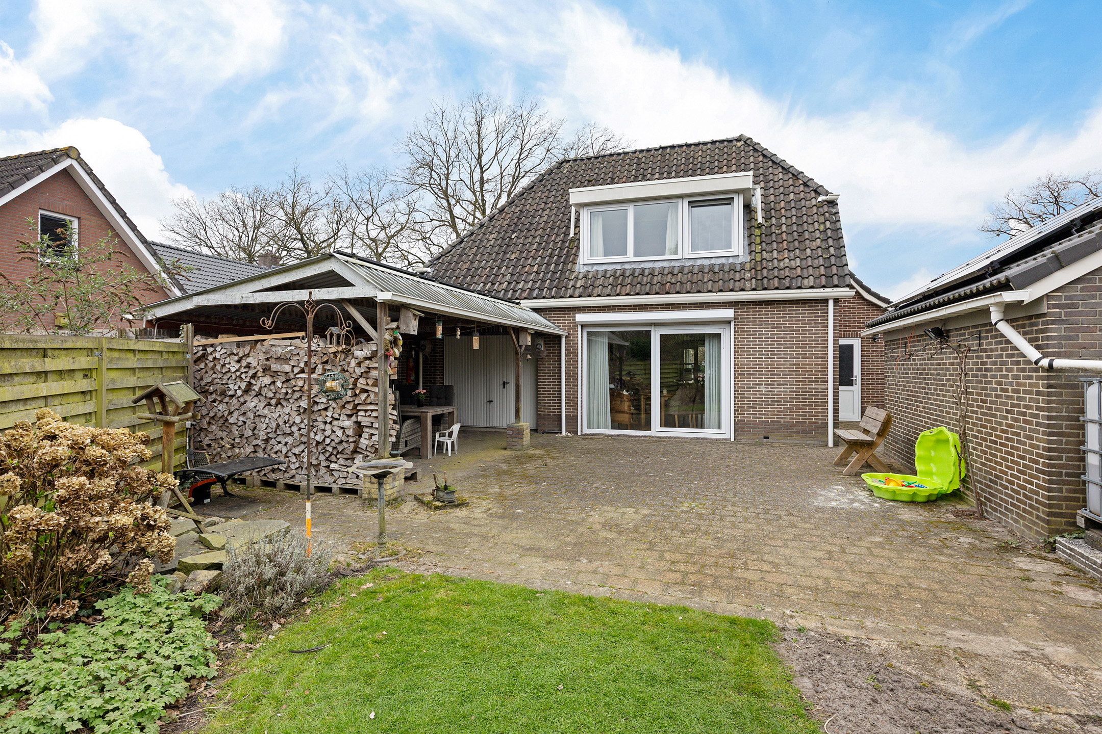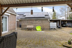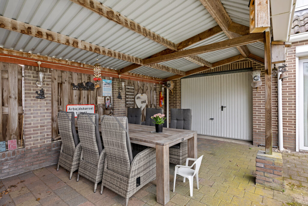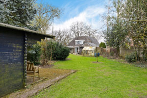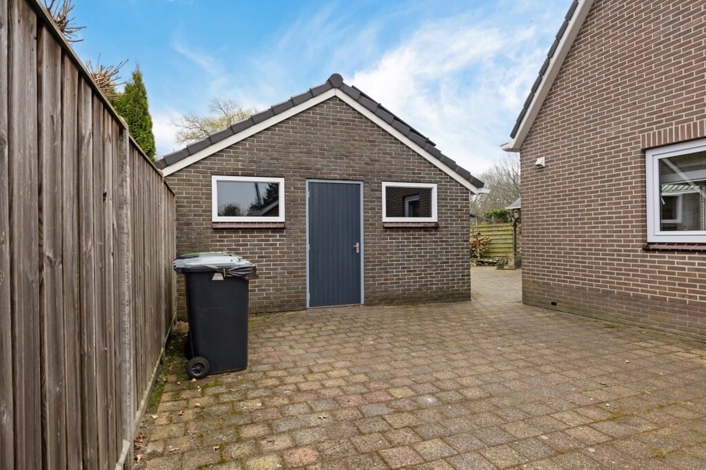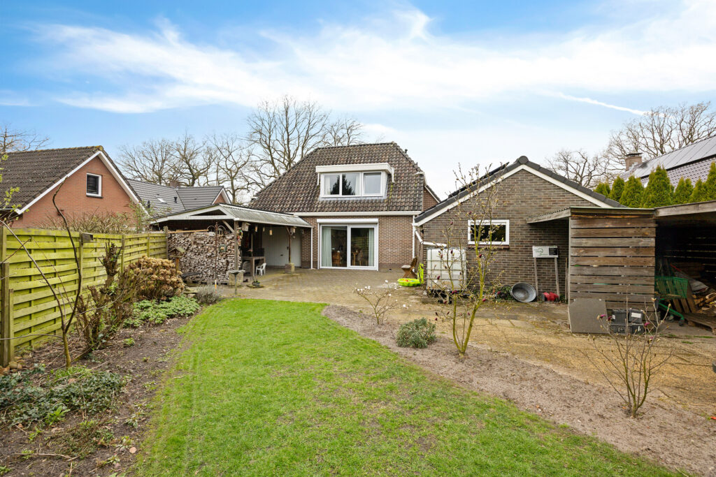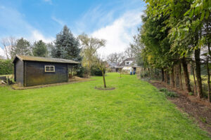 Via de keuken stap je door de schuifpui zo de tuin in, waar je wordt verrast door een sfeervol geheel met een vrijstaande stenen berging, een charmante houten blokhut en meerdere overkappingen, ideaal voor ontspannen momenten in elk seizoen.