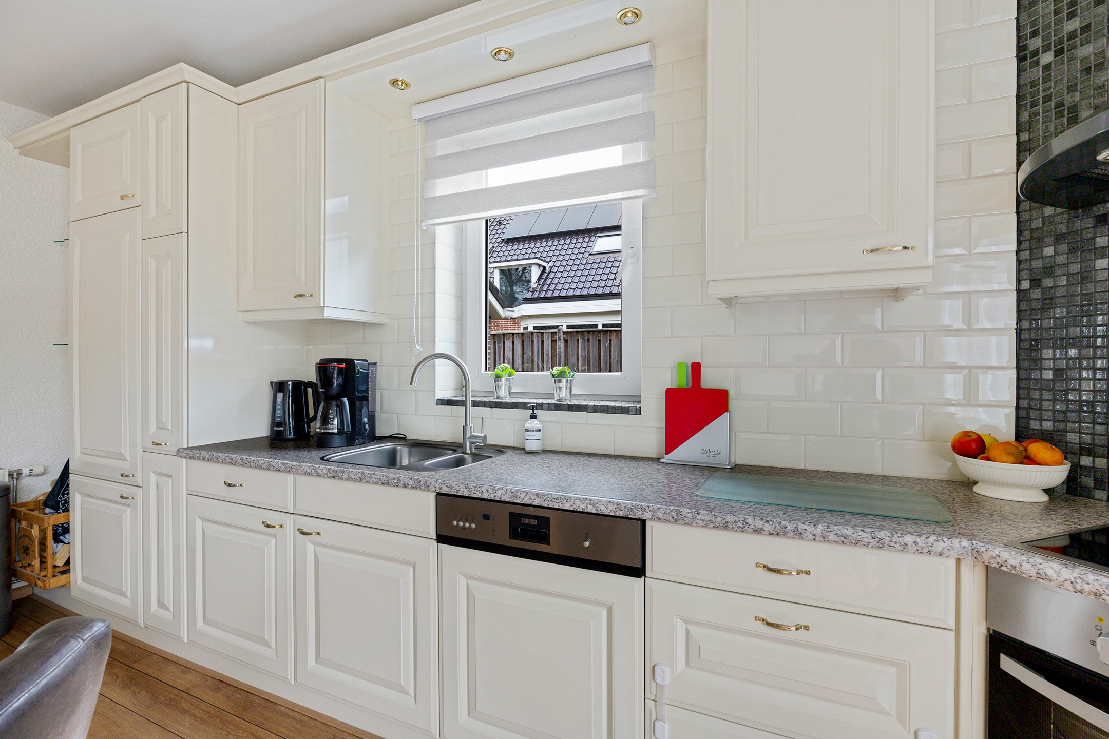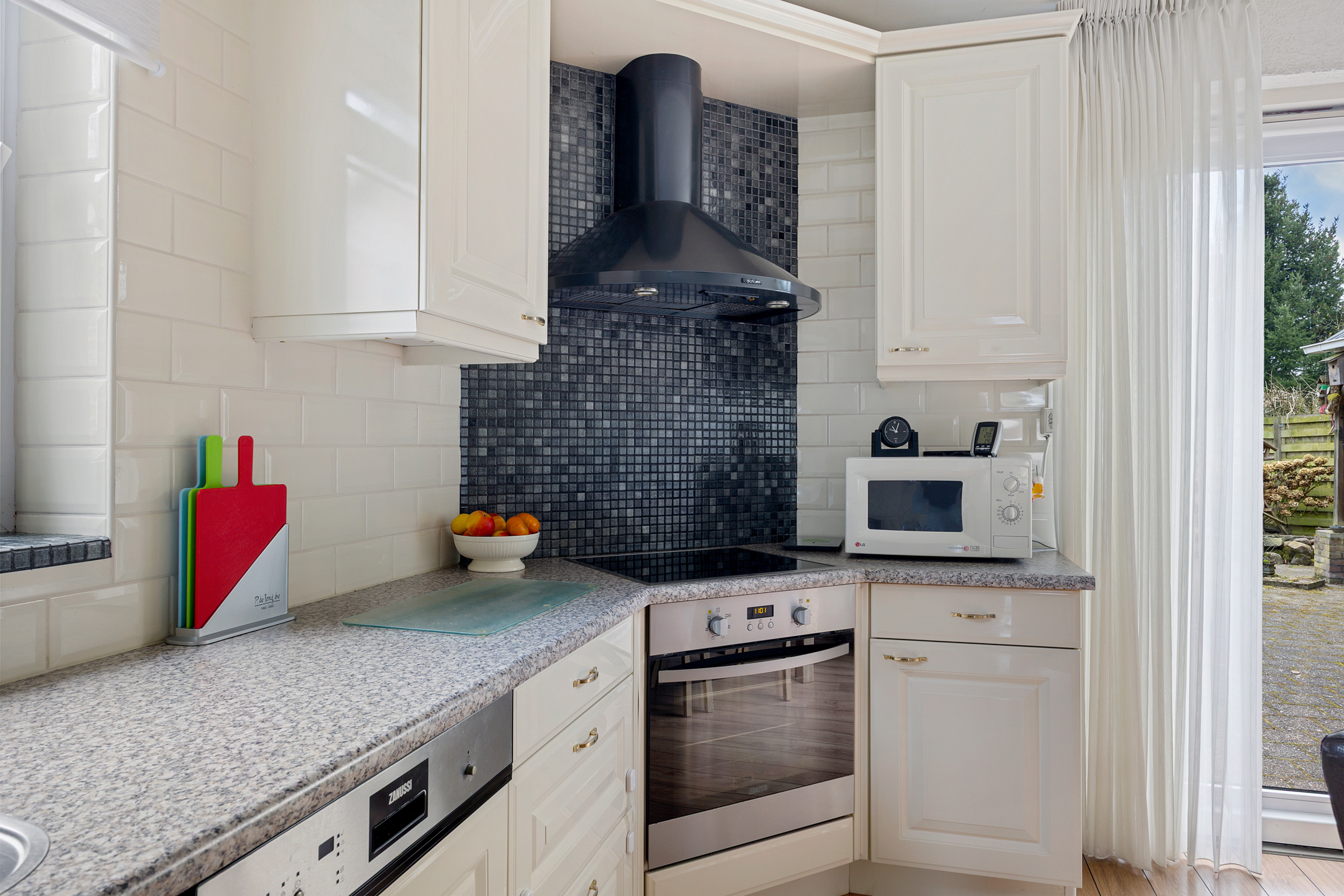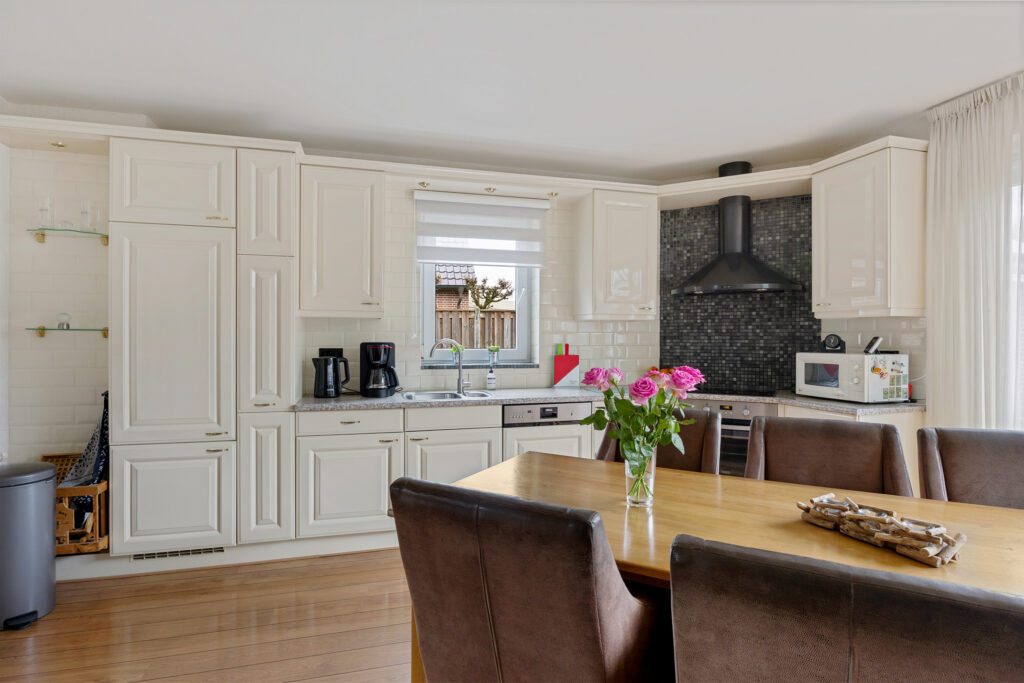 - keuken, voorzien van vaatwasser, inductie kookplaat, koelkast, oven en afzuigkap. Schuifpui naar de achtertuin en eveneens voorzien van airconditioning;