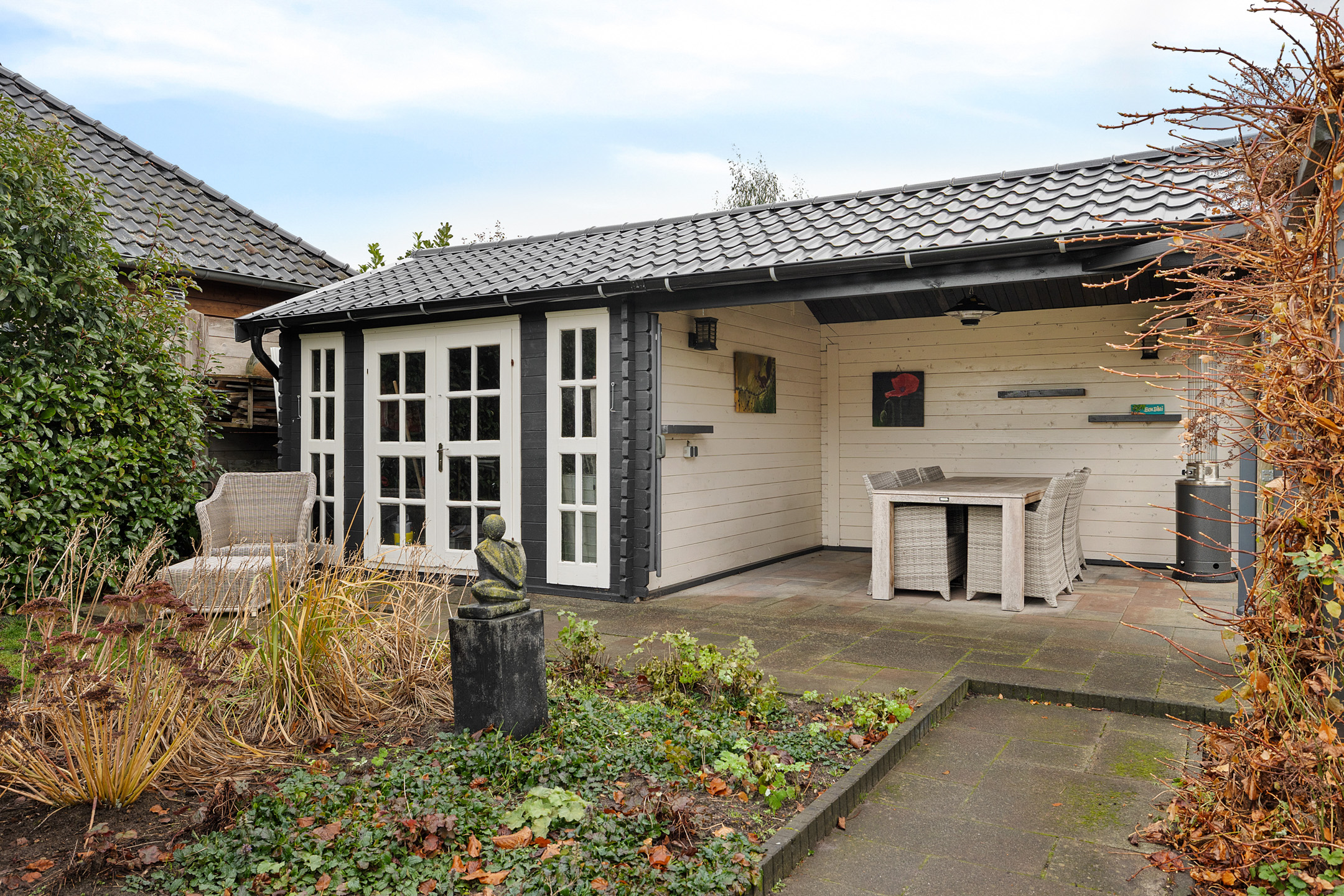 - vrijstaand houten tuinhuis, voorzien van elektra en verlichting.