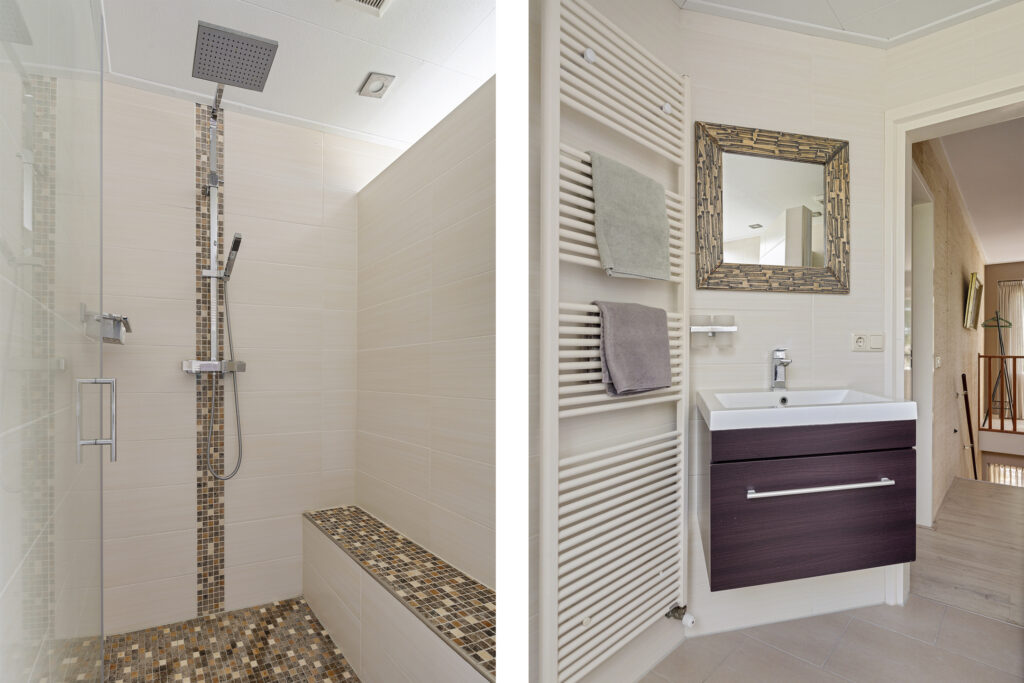 - badkamer met 2 wastafels, inloopdouche, toilet, urinoir en designradiator.