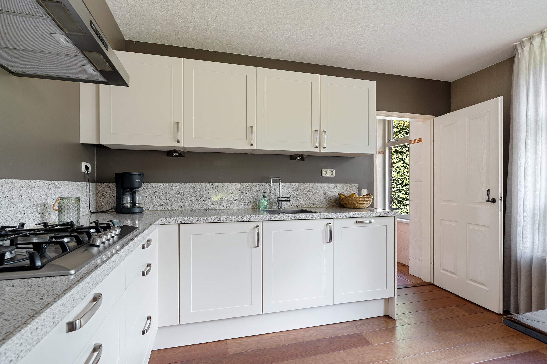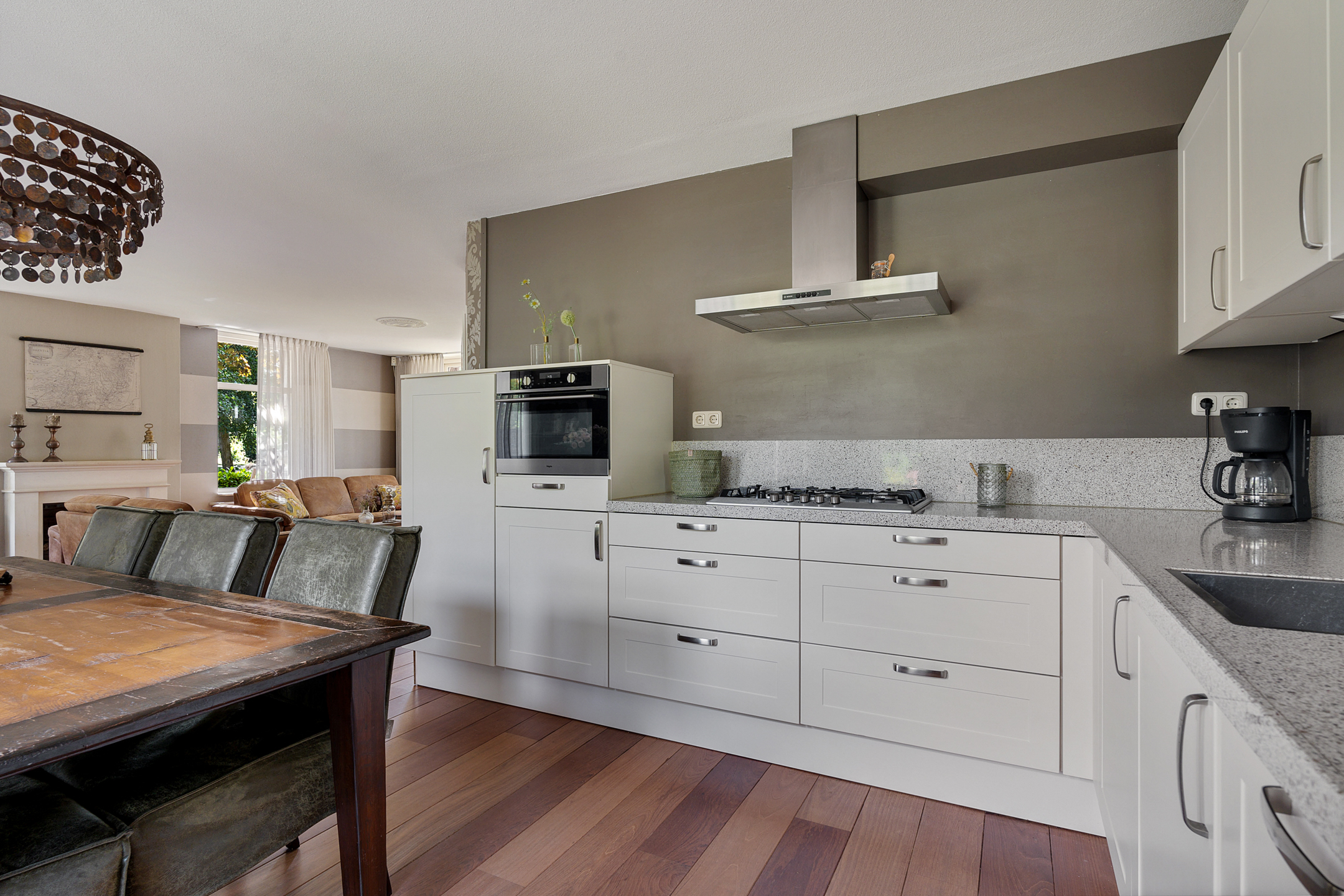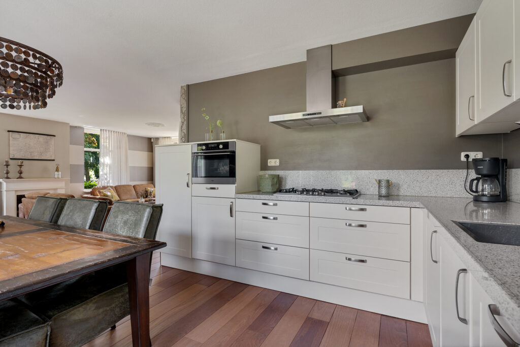 - open keuken, o.a. voorzien van granieten blad, 5 pits gaskookplaat, vaatwasser, koelkast, combi-magnetron en afzuigkap;
