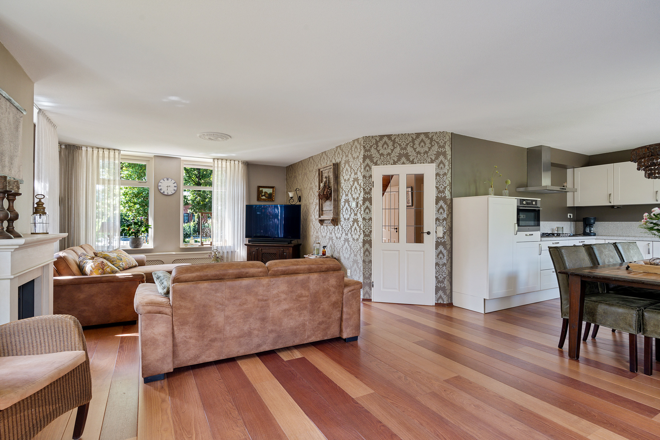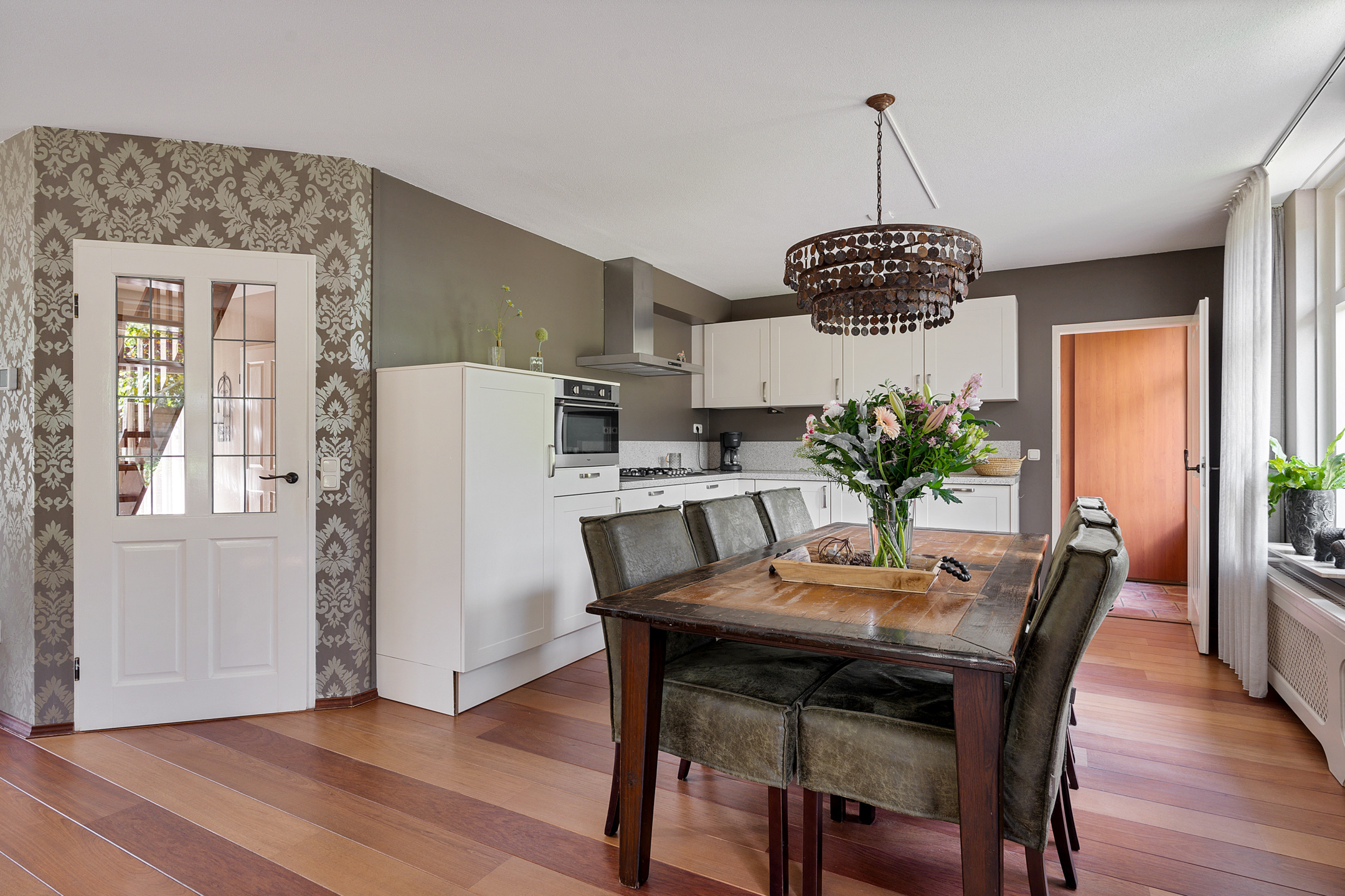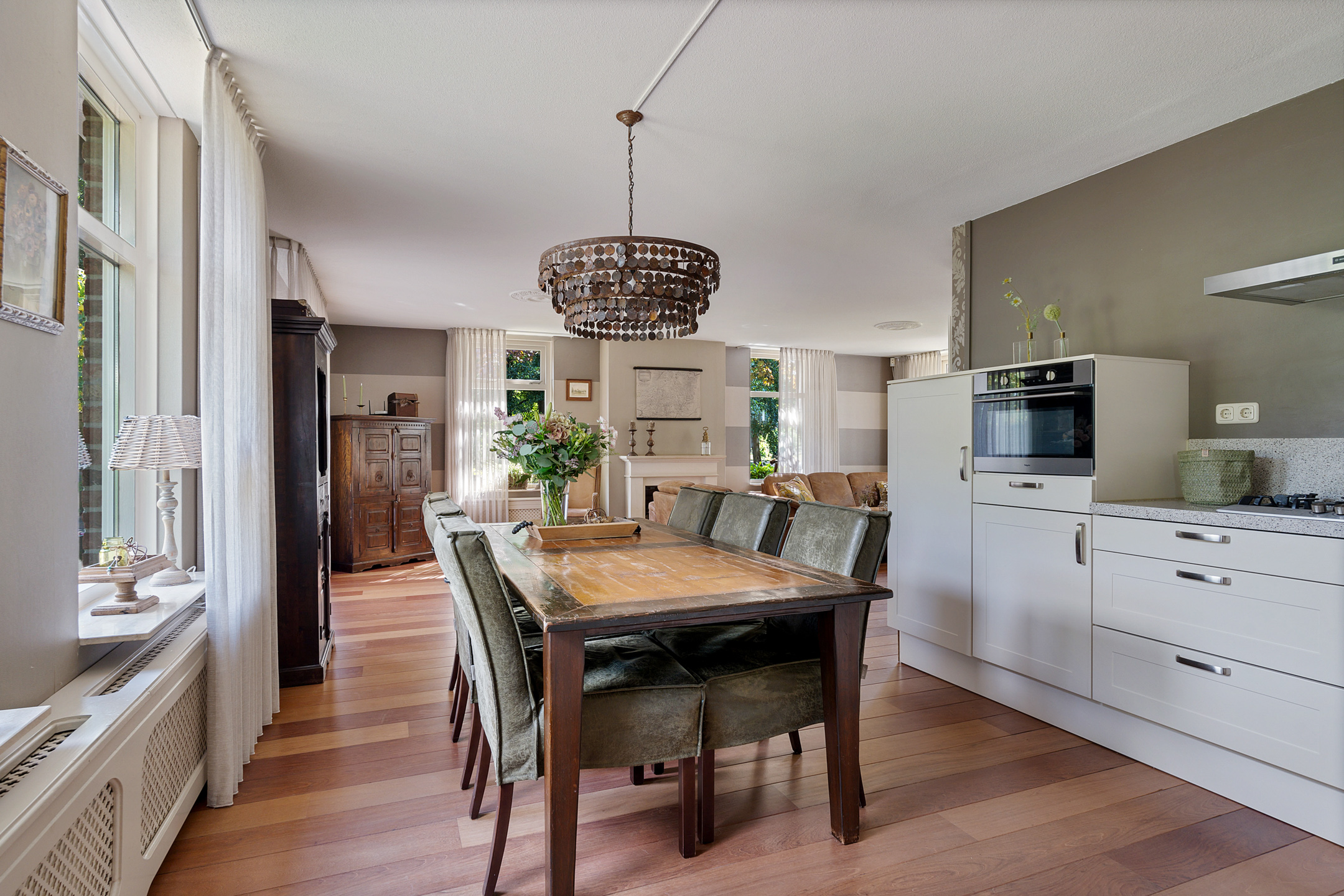 - open keuken, o.a. voorzien van granieten blad, 5 pits gaskookplaat, vaatwasser, koelkast, combi-magnetron en afzuigkap;